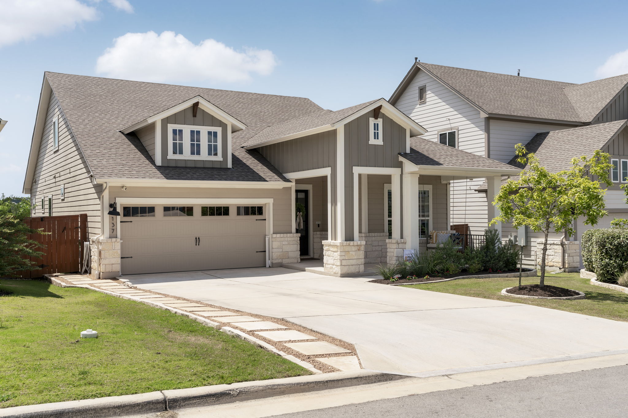Welcome to the rare Kingsview floorplan by David Weekley, where thoughtful design meets Hill Country living. This home is more exquisite than a model home. Experience the art of elevated living, where every detail exudes luxury. This stunning residence features four bedrooms and three full baths, with the primary suite and an additional guest bedroom conveniently located on the main level. A dedicated home office with double doors provides a quiet space to work or create. From the moment you enter, you're greeted by a soaring two-story foyer that opens into a bright and spacious living room, dining area, and kitchen, all framed by tall ceilings and expansive windows showcasing lush greenbelt views. Custom design touches such as shiplap accents, chic tile selections, designer lighting, custom motorized shades, and luxury vinyl plank wood flooring throughout the main level add warmth and style. Enjoy peaceful evenings in the private backyard or explore the outdoors with direct trail access just beyond the property line. The main-level primary retreat features a sitting area, fireplace, and incredible views. A spa-inspired en-suite bath awaits with dual raised vanities, designer tile backsplash, a separate walk-in shower, soaking tub, and a custom walk-in closet. Upstairs, you'll find a media room, a flexible second living space, two spacious bedrooms, and a full bath, ideal for guests, teens, or multi-generational living. One of the home’s most captivating features is the covered upstairs balcony, offering long-distance Hill Country views, a rare bonus that truly sets this home apart. The epoxy-finished two-car garage, charming front porch, and covered back patio plumbed for gas make this home as functional as it is beautiful. Tucked into the award-winning Headwaters master-planned community, this home offers a blend of nature, luxury, and modern living. Don't miss your opportunity to call this one-of-a-kind property home