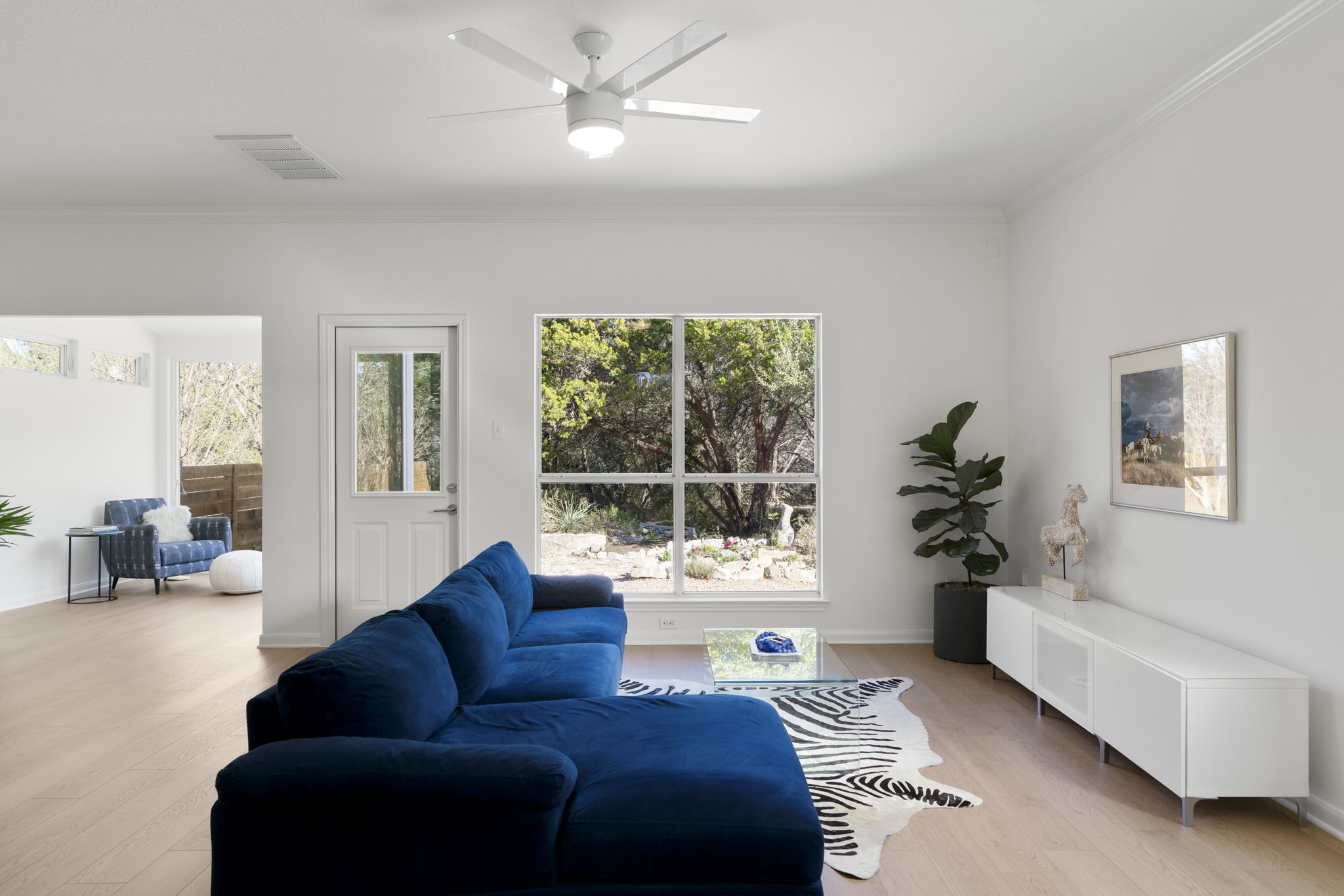 This one-of-a-kind Modern Texas Farmhouse is located in the heart of Southwest Austin on a rare 1/3-acre lot overlooking peaceful ranch land. Spectacularly remodeled in 2026, this townhouse-style condo offers breathtaking views from every room and the privacy of ranch living with the ease of a lock-and-leave lifestyle. At 1,912 sq ft, this is the largest home in the development and features three bedrooms, three bathrooms, two living areas, and a two-car garage. The open floor plan is enhanced by high ceilings, walls of windows, wide-plank oak-style flooring, and designer finishes throughout, including three spa-inspired custom bathrooms. The spacious primary suite offers a private balcony, oversized walk-in closet, and a luxurious ensuite bath with dual vanities, deep soaking tub, separate walk-in shower, and private toilet room. A large privacy window fills the space with flattering natural light. The remodeled kitchen is designed for both cooking and entertaining, featuring a center island with breakfast bar, creamy white cabinetry, deep gray quartz countertops, subway tile backsplash, gas range, stainless steel sink, water filtration system, built-in microwave, under-cabinet lighting, and upgraded recessed lighting. Storage is abundant with a pantry, coat closet, oversized linen closet, and under-stair storage. The expansive private backyard is shaded by majestic oak and cedar trees and landscaped with native Texas plants to support local wildlife—perfect for year-round outdoor living. Ideally located near downtown Austin and Bee Cave, with easy access to Hill Country Galleria, Arbor Trails, Lantana Center, top dining, shopping, and schools. Enjoy walks to the neighboring vineyard or The Natural Gardener. Google Fiber available. This exceptional home won’t last long. Pre-Inspected to provide you with peace of mind of the fantastic condition of this home.