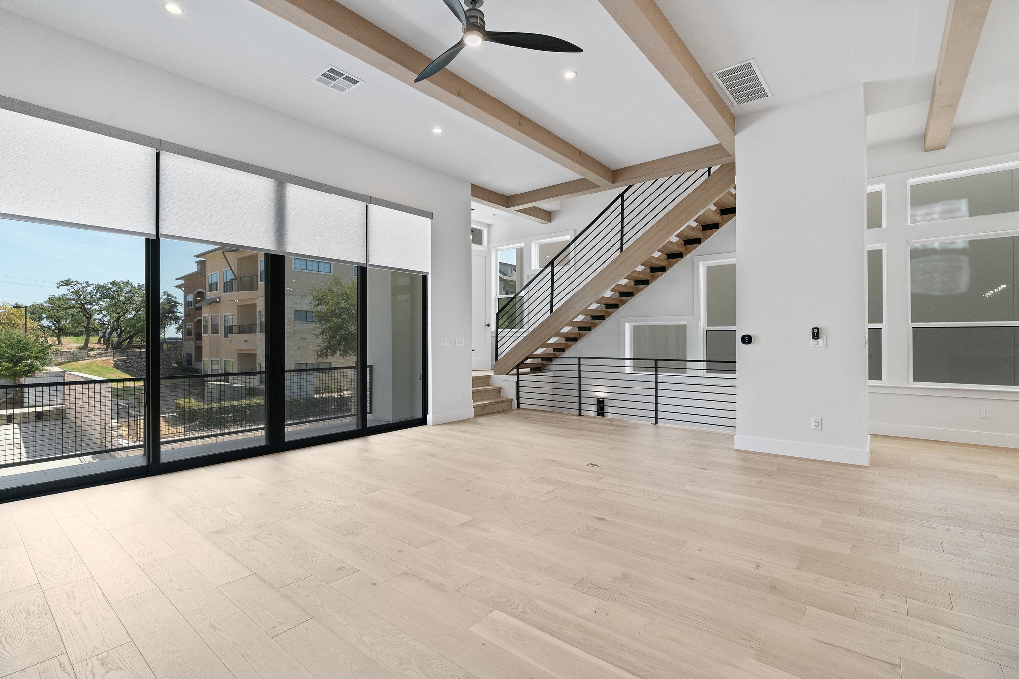 Experience the seamless fusion of modern architecture and impeccable finishes in this captivating loft-style home located in the Hill Country Galleria. Spanning 3 well-designed levels and an attached 2-car garage with storage racks, this residence offers both style and functionality. As you step inside, 5-inch wide plank hardwood floors guide you through the meticulously crafted floor plan. The main floor features a stunning and spacious bedroom adorned with board and batten accents, a contemporary ceiling fan, and a walk-in closet. The ensuite bath boasts a sleek walk-in shower, providing a luxurious haven for in-laws or guests. Ascending the staircase to the 2nd floor, you'll be greeted by an expansive main living space with soaring 12-foot ceilings. The gourmet kitchen is a chef's dream, showcasing an oversized center island, quartz countertops, tile backsplash, and shaker-style cabinetry. High-end KitchenAid stainless appliances (including the custom, built-in fridge and wine fridge) add the finishing touch. This space effortlessly flows into the grand living room, where a wall of floor-to-ceiling sliding glass doors framed by custom power shades creates an airy and inviting atmosphere. The wood-beamed ceiling and electric fireplace with a floor-to-ceiling tile surround enhance the elegance. The adjacent balcony offers a serene spot to enjoy views of the meticulously maintained community. The 3rd floor is a haven of relaxation, featuring an oversized primary suite adorned with custom accents and large windows with custom shades. The ensuite bath exudes opulence with a dual vanity, LED-lit mirror, and a spa-like walk-in shower. The incredible walk-in closet comes complete with custom storage and built-ins. Two additional bedrooms on this floor provide versatility and comfort for family or guests. W/D Convey! You'll have access to the amenities of the Hill Country Galleria, including upscale shopping, dining, Cinemark, Whole Foods, walking trails and much more.