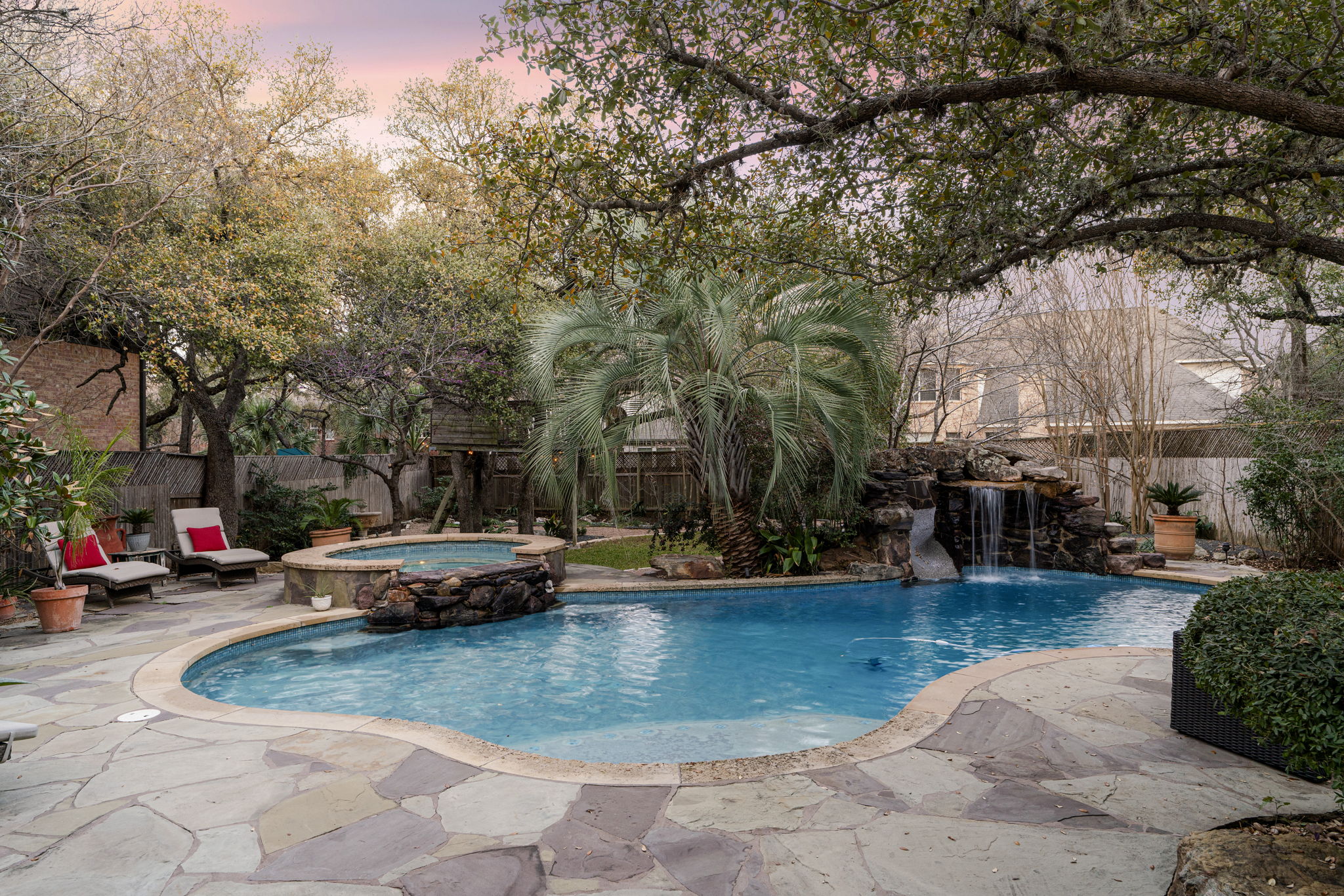 This Circle C Ranch, 5 bedroom, 3.5 bathroom, 2 story home, with a dedicated office and formal dining area, offers a sprawling layout and a backyard resort on over a 1/3 of an acre, shaded by 60-foot Oak and Elm trees. Positioned on a quiet double cul-de-sac, this residence brings a sense of privacy and scale rarely found. The Circle C Ranch community is known for its tree-lined streets and active lifestyle, and this property sits at the center of it all, offering immediate access to the neighborhood’s extensive trail system and premier community amenities. Living in Circle C Ranch places you 11 miles of Downtown Austin and 16 miles from the Austin Airport. The proximity to MoPac ensures that while the home feels tucked away, the rest of the city is easily reachable. The open-concept kitchen and breakfast area flow into the living room, where a custom rock fireplace serves as a focal point. The kitchen features granite countertops, a center island, and a wrap-around breakfast bar that separates the cooking space from the living area. The primary suite is located on the main floor for maximum privacy, featuring a wall of windows that look out toward the pool and an ensuite bath with a standalone soaking tub, walk-in shower, and dual vanity. Moving upstairs, a large game room with built-in bookshelves serves as a secondary living space, with windows that provide an elevated view of the backyard canopy. 3 guest bedrooms and 2 full bathrooms are also located on the 2nd story. The backyard is centered around a 9.5-foot deep pool. This outdoor space is equipped with a grotto and waterfall, alongside a large hot tub and stone patio. The grounds include a custom treehouse and a firepit area, all shielded by lush landscaping and mature trees. Whether you are in the kitchen or the living room, large windows keep the backyard greenery in view, grounding the home in its unique Circle C Ranch setting.