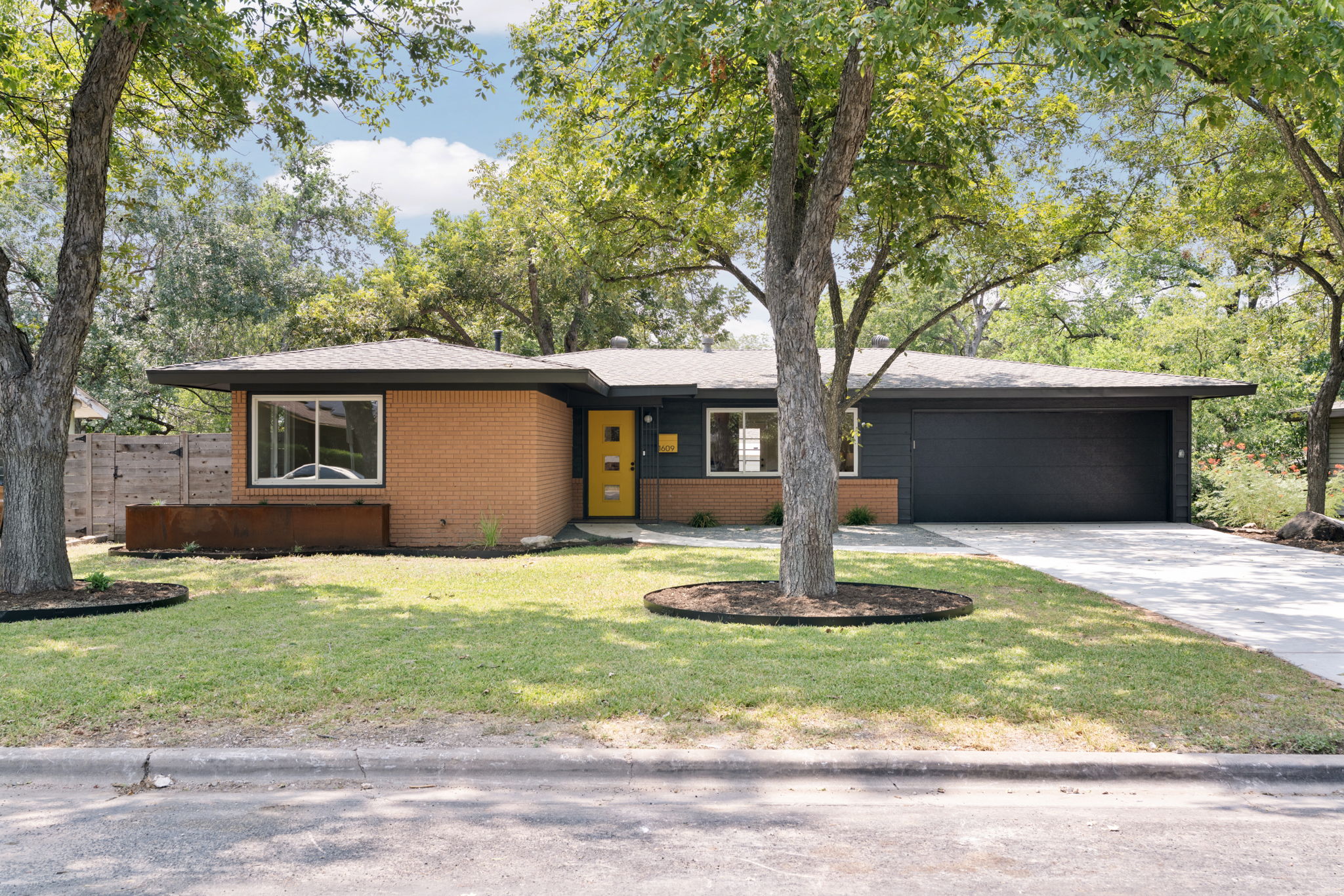 Outside, original red brick contrasts beautifully with dark siding, while a new driveway, fresh landscaping, shade trees, and updated mailbox enhance the curb appeal. A custom steel planter replaces the original brick, bringing a contemporary touch while maintaining the home’s original architectural lines.