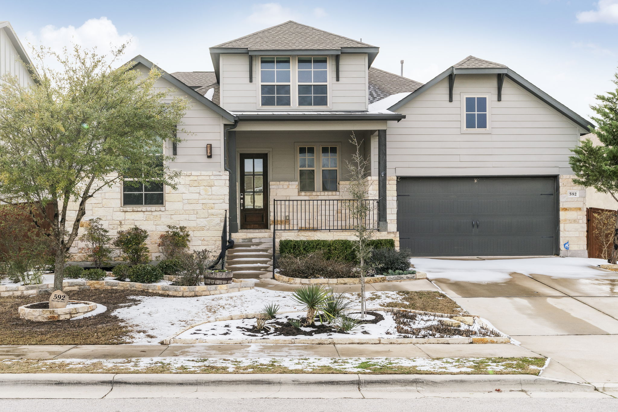 Easy Hill Country living in the heart of Headwaters. Set on a scenic greenbelt lot with peaceful views, this thoughtfully designed two-story home offers the perfect balance of space, comfort, and community. The bright and open floor plan features four bedrooms, three and a half baths, and multiple living areas that flex with your lifestyle. The main level includes a dedicated office with French doors and custom built-ins ideal for work-from-home days. The spacious living room offers slider doors and is anchored by a gas-burning fireplace. The kitchen opens to the living and dining areas and offers stainless steel appliances, generous cabinetry, tile backsplash, stone countertops, a pantry for everyday storage, and an oversized island. The primary suite is tucked away on the main level with serene backyard views, a soaking tub, walk-in shower, dual vanities, and a walk-in closet. Upstairs, a secondary living area provides space for a game room, media lounge, or homework hub, alongside a comfortable secondary bedroom and bath. Recent updates include fresh interior paint and new carpet in bedrooms and the upstairs game room. Outdoor living is easy here, with a covered patio overlooking a fully fenced yard and greenbelt scenery, perfect for morning coffee, weekend play, or evening unwinding. A three-car tandem garage, mudroom, and main-level utility room add to the home’s everyday functionality. Located in the International Dark Sky Community of Headwaters, residents enjoy miles of trails, hilltop views, a top-tier amenity center, and highly rated Dripping Springs ISD schools, including Wildwood Springs Elementary right in the neighborhood. This is Hill Country living made simple, social, and comfortable.