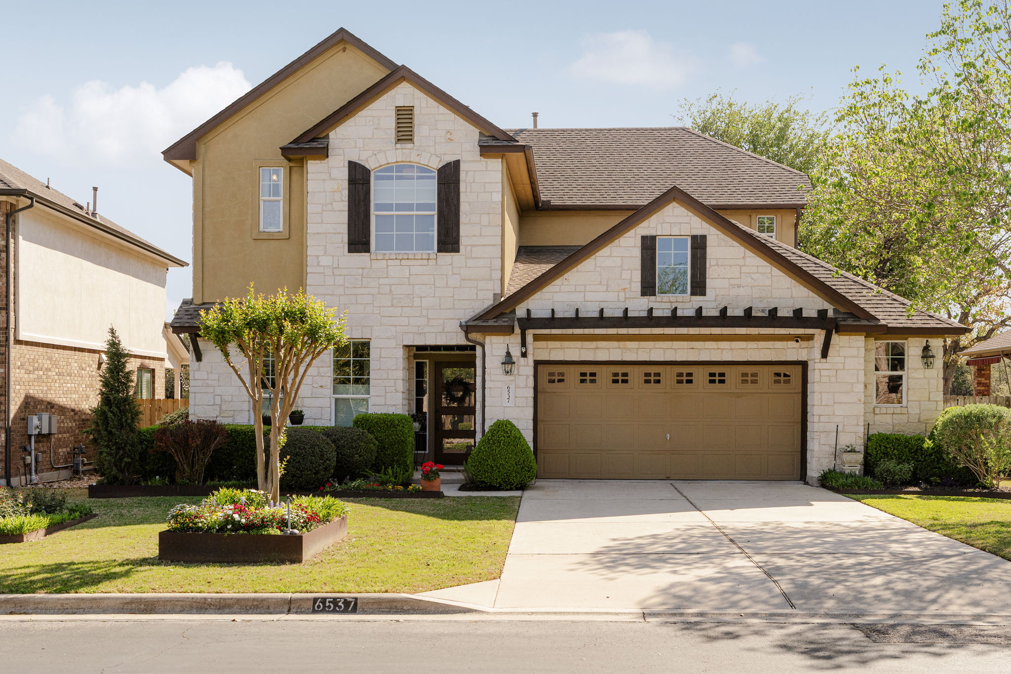 This Esquel single-family home is situated on a quiet cul-de-sac with a backyard that opens directly onto a lush greenbelt. With 5 bedrooms, 4.5 bathrooms, and a 2-car garage equipped with an EV charger, this home offers more than enough room for the whole household to spread out comfortably. The Esquel neighborhood is known for its friendly atmosphere, where sidewalks connect you to the community pool, park, and playground. Being in the 78739 zip code, you are about 14 miles from Downtown Austin and 18 miles from the airport, offering a quieter pace of life without losing quick access to the city. The main floor is centered around a large living room with two-story ceilings and a wall of windows. The light in this part of the house is incredible, especially in the afternoons. The living area stays connected to the kitchen and breakfast area, which features a large serving bar, perfect for entertaining. The kitchen is a practical hub for the home, with a large center island, granite countertops, and plenty of storage. You will also find a dedicated office and a formal dining area on this level, both finished with wood flooring and crown molding. One of the stand-out features of this floor plan is having the primary suite and a full guest bedroom both on the main floor. The primary bedroom has a deep bay window that creates a quiet spot to sit and look out at the trees. The ensuite bath is well-sized with a wrap-around dual vanity, soaking tub, separate shower, and a walk-in closet. Upstairs, the home features an large game room that acts as a second living space. With 3 more bedrooms and 2 full bathrooms on the second floor, the upstairs remains a private wing for the rest of the household. Outside, the covered back patio looks over the greenbelt with the Grey Rock Golf Course just on the other side. For daily needs, you are just 2.5 miles from HEB and 3 miles from the Alamo Drafthouse, keeping South Austin’s best dining and essentials within a five-minute drive.