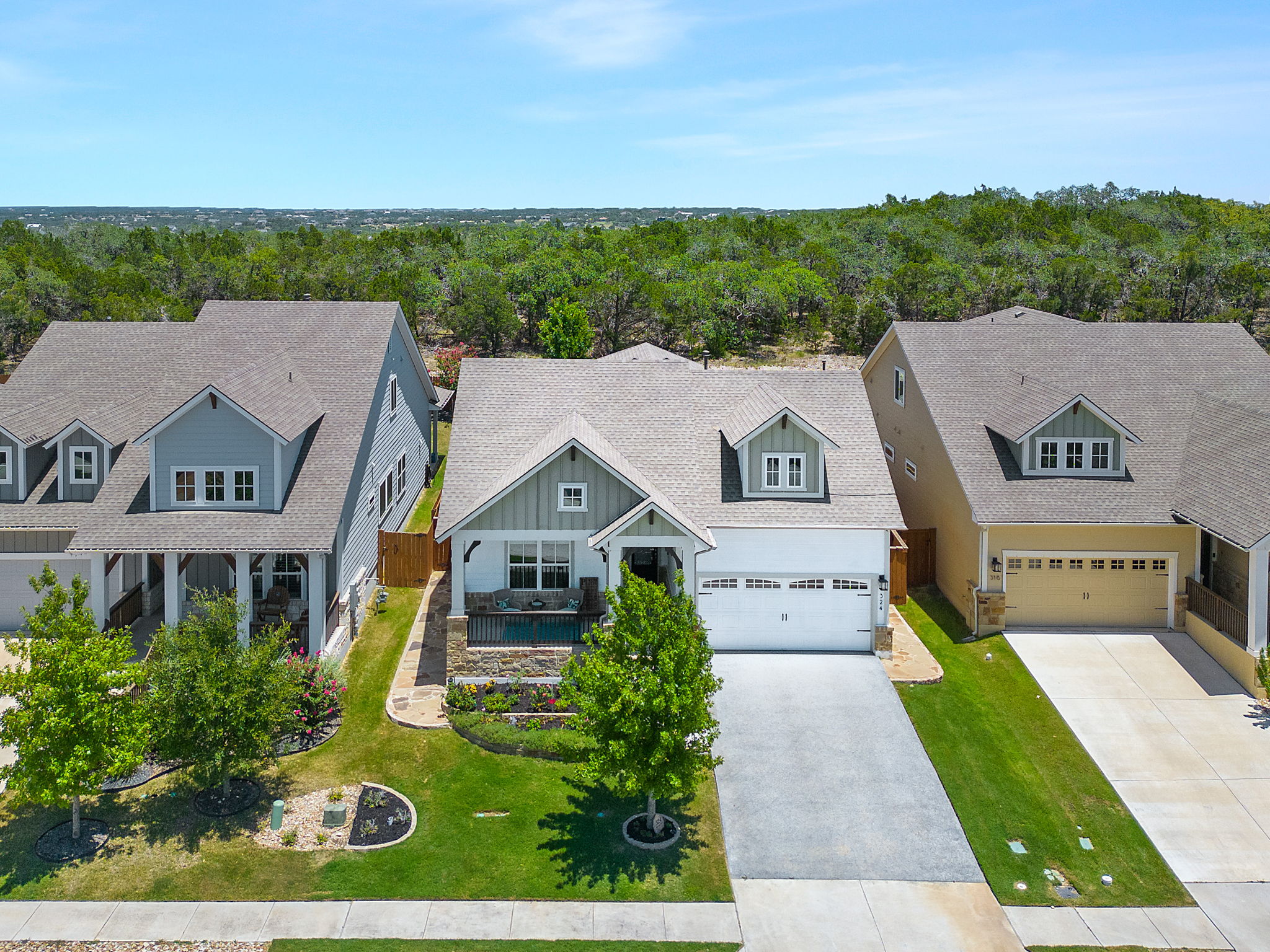 Exceptional David Weekley Smart Home with Every Upgrade Imaginable! Nestled against the backdrop of a hilltop greenbelt in the dreamy International Dark Sky Community of Headwaters. Built in 2017, this gently live-in meticulously maintained home offers gorgeous curb appeal with a pervious driveway, pillared front porch & lovely flagstone pathways leading to the backyard oasis. One-level flexible floorplan with 3BDs/2.5BA PLUS a sophisticated study. Featuring wood-inspired tile, tray ceilings, crown molding, recessed lighting, and stylish fixtures throughout. Enjoy the ultimate open living area enhanced with expansive windows for peaceful views & natural light. Surround sound throughout & on the back patio is perfect for entertaining! The chef-inspired kitchen features sleek granite countertops, island seating, timelessly elegant, soft-close cabinetry, designer backsplash, and built-in SS appliances. The oversized center island is accentuated by custom hand-blown pendant lighting made by renowned glass blower, Buzz Blodgett. Tucked away in the back of the home, the main suite offers greenbelt views, a dreamy walk-in closet, and a luxurious spa-like ensuite bath. Smart systems include blinds, thermostat, security, and irrigation making living easy in this home! Step outside to an expansive covered porch featuring cool Trex decking, a cozy outdoor gas fireplace & picturesque stone-lined planting areas w/ a soothing water feature. The backyard oasis is surrounded by a tranquil, protected wooded hilltop, which provides amazing views & excellent privacy. Residents of Headwaters enjoy award-winning Dripping Springs schools, a state-of-the-art amenity center, trail systems, parks, and preserved open spaces. Nearby you will find several hill country wineries, breweries, distilleries, restaurants, and more. Just 25 min west of Downtown Austin and 30 min to the airport. Be sure to watch the video! This is the hill country lifestyle you deserve!