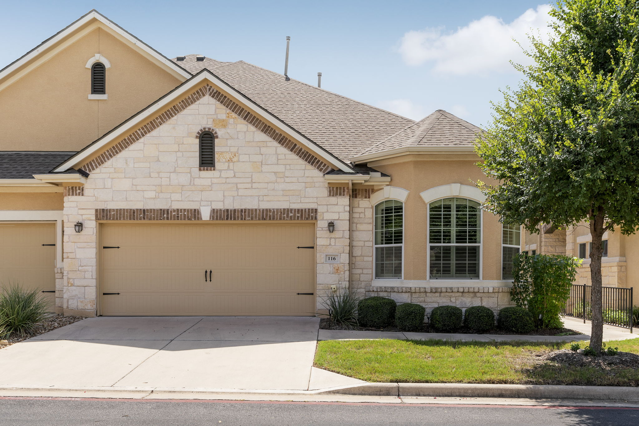 Welcome to 116 Perpetuation Drive, where home is not just a place, it’s a whole vibe. Set in The Vistas at Lakeway, this condo has been impeccably maintained and offers the rare opportunity to live a lock-and-leave lifestyle with all the perks. Just steps from the pool and fitness center, and with the HOA handling all exterior upkeep, you can spend your time doing what you love instead of worrying about the little details. Inside, the first thing you’ll notice are the freshly painted walls, updated crown molding lighting throughout the main living areas, 12-foot ceilings and hardwood floors. The kitchen doesn’t just get the job done, it does it in style. Think granite countertops, glass tile backsplash, and stainless appliances. It's a spot where casual dinners or impromptu get-togethers come together effortlessly. The primary suite is a real standout! The freshly updated carpet is just the beginning. The ensuite bath feels more like a personal spa than a bathroom; soaking tub, walk-in shower, dual vanities, and all the space you need to refresh in peace. The main floor hosts a dedicated office and a guest room, giving you space to balance productivity and hospitality. Upstairs, you’ve got a bonus room that can be a game room, home office, media lounge, yoga retreat; whatever you need, this space adapts to you. Plus, there’s a private bedroom and bathroom, ensuring everyone gets their own space. Out back there is a fully fenced retreat that’s not just another yard. Mature oaks provide shade, along with a covered patio that will be your new go-to for mornings with coffee, evenings with wine, or any time you need a quiet moment to yourself. And as for location, Lakeway’s vibrant charm is all around you. Across the street from HEB, just steps from all the amenities you could want, and surrounded by the buzz of a community that’s anything but ordinary. Ready to move in and make it yours? This isn’t just a place to live; it’s where life gets good.